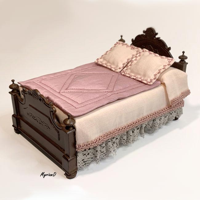 Avec sa tête et son pied orné de sculptures, ce modèle respecte les normes de l'époque.Accessoires décoratifs : l’âme des intérieurs miniatures