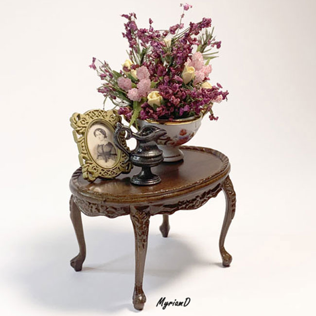 Agrémenté d'une combinaison d'objets disparates : pot en étain, bouquet et cadre typiquement victorien.